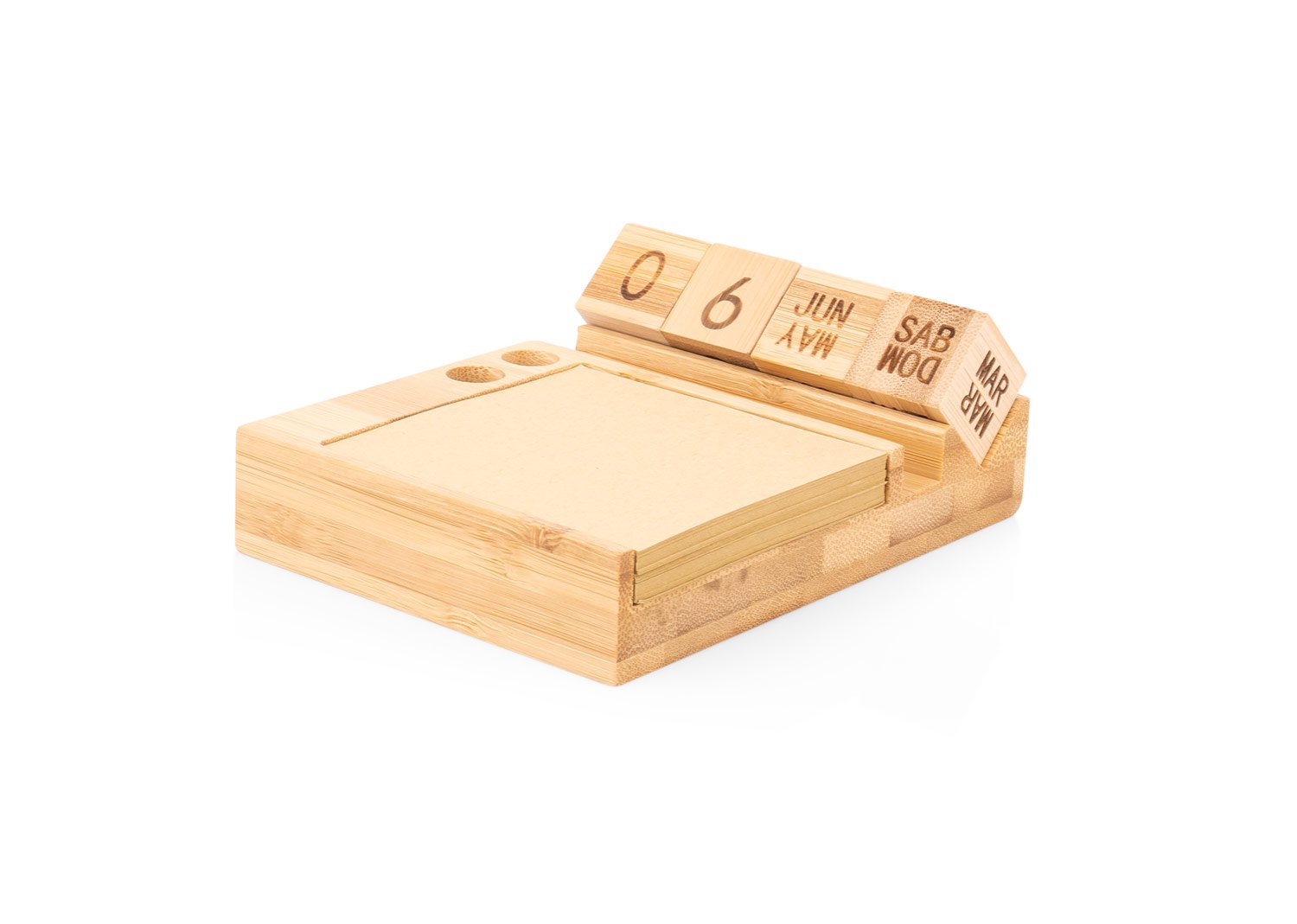 Porta notas de bambú con calendario perpetuo que muestra día, fecha y mes de forma continua, sin necesidad de reemplazo anual. Incluye 4 bloques giratorios de madera (2,3 X 2,3 X 2,3). Contiene 100 hojas de papel tipo kraft (7,6 X 7,6) y compartimentos para bolígrafos o accesorios. Diseño funcional y ecológico para escritorio. MATERIAL: Bambú MEDIDAS: Formato: (Ancho X Alto X Profundo): (13,2 X 9,5 X 2,6). Peso: 203 gr. ÁREA DE IMPRESIÓN APROXIMADA: Tampo: 4cm x 1cm. Láser:1,5 cm X 4 cm.