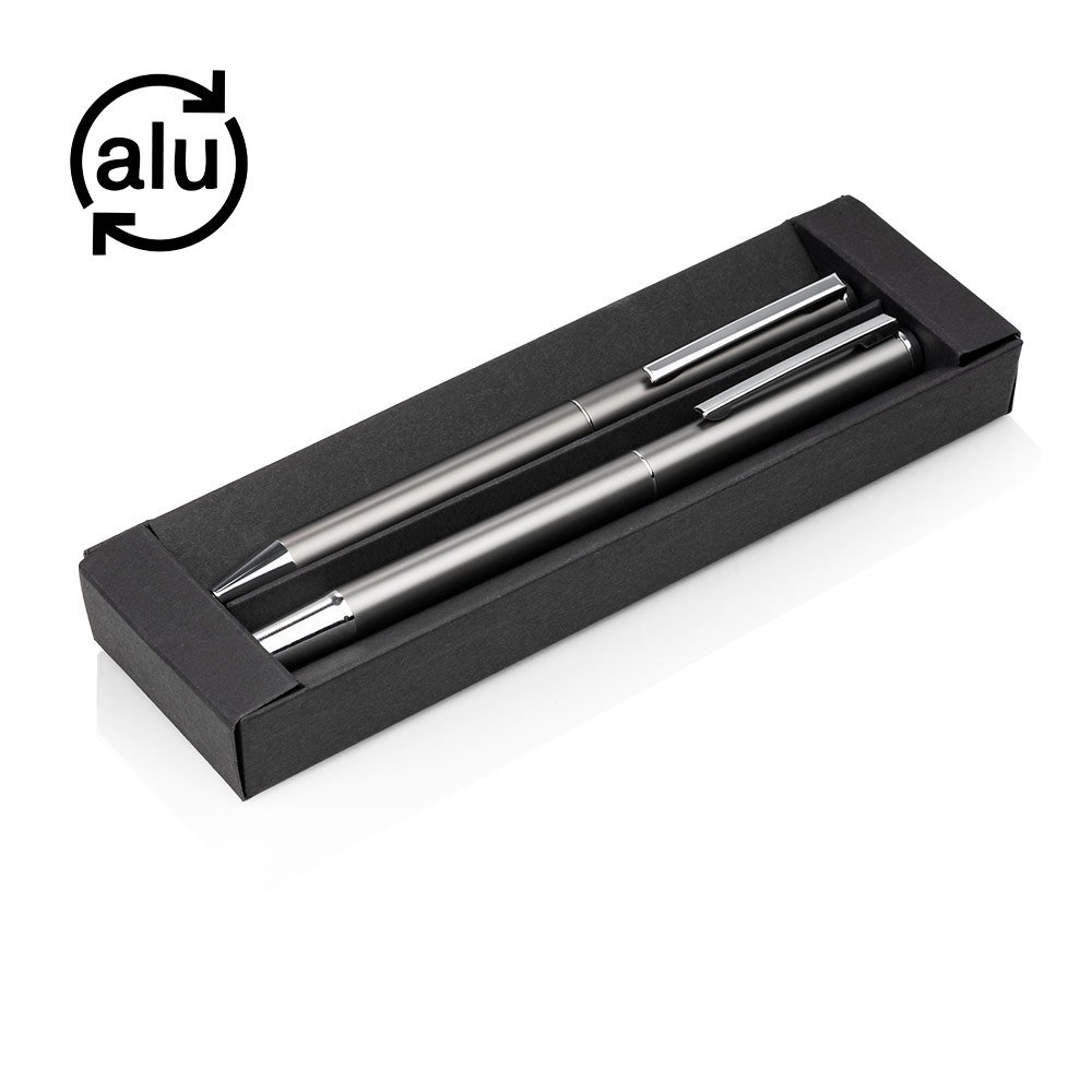 Set de Bolígrafos hechos con aluminio reciclado. Cada Bolígrafo es retráctil de mina normal más Bolígrafo roller, con tapa a presión. Incluyen estuche de lujo. (Bolígrafo/Esfero) MATERIAL: Aluminio reciclado en caja negra de papel MEDIDAS: Boligrafo 14 cms. Boligrafo Roller 14,3 cms. Estuche 5,3cm x 2,3 cm x 17,3 cm ÁREA DE IMPRESIÓN APROXIMADA: Tampo: Estuche 7,5 cm x 3 cm. Laser: Boligrafos. Láser :4cm X 0,7 cm
