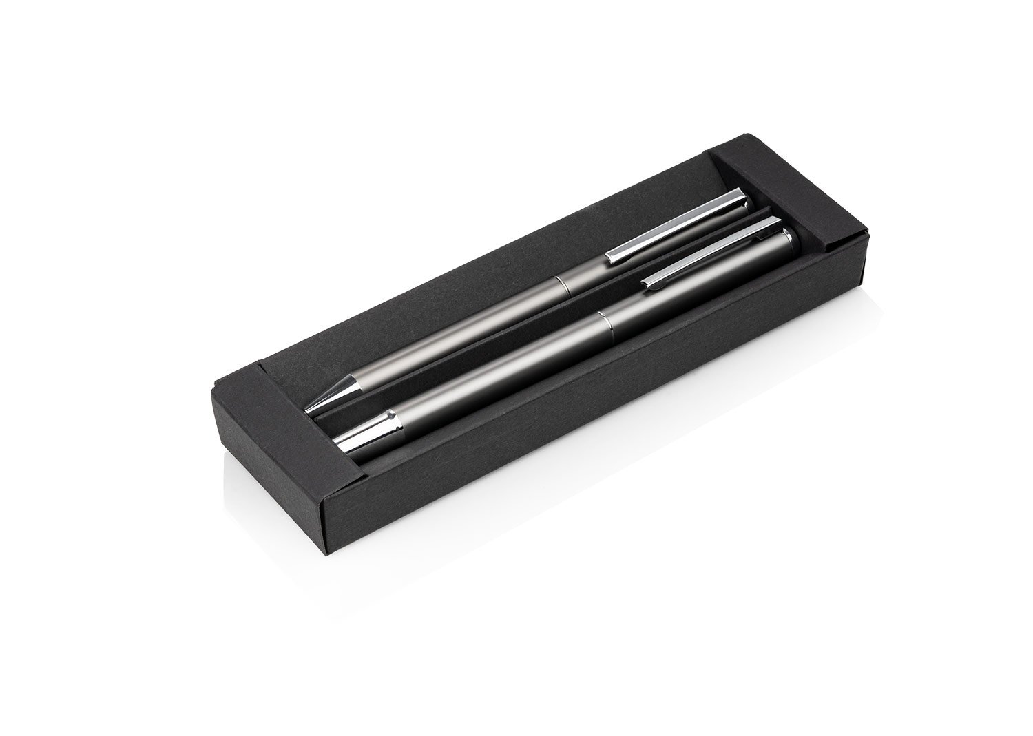 Set de Bolígrafos hechos con aluminio reciclado. Cada Bolígrafo es retráctil de mina normal más Bolígrafo roller, con tapa a presión. Incluyen estuche de lujo. (Bolígrafo/Esfero), MATERIAL: Aluminio reciclado en caja negra de papel MEDIDAS: Boligrafo 14 cms. Boligrafo Roller 14,3 cms. Estuche 5,3cm x 2,3 cm x 17,3 cm ÁREA DE IMPRESIÓN APROXIMADA: Tampo: Estuche 7,5 cm x 3 cm. Laser: Boligrafos. Láser :4cm X 0,7 cm